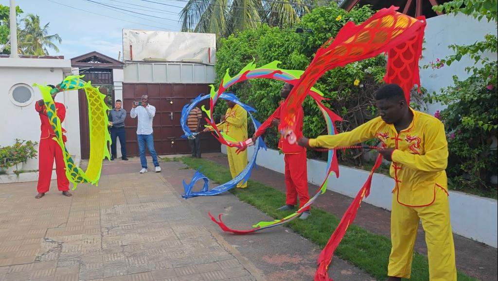 在博物馆谢燕申馆长开场致辞后,活动正式拉开帷幕。首先是孔院学生带来的彩带舞龙表演,色彩鲜艳的“彩带龙”在空中活灵活现,摇曳多姿,时而上下翻飞,时而辗转盘旋,精湛的表演引得大家阵阵喝彩。随后,非洲舞团为嘉宾们表演了一段自由奔放、独具当地特色的非洲舞,热烈劲爆的舞蹈配合着高亢明快的非洲鼓声,让人想置身其中,跟着节奏一起律动。