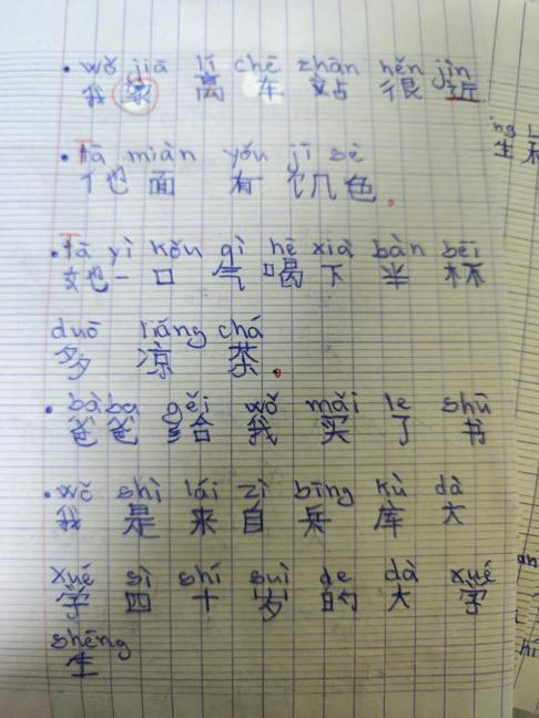 学生们的语言创造力常带我来意外之喜。在水平班三年级的课上,面对“你 洗 水果 好 吗 了”的组句题,吴克杰同学手一举:“老师,请问可以说‘你好,水果洗了吗’吗?”"啊......这出乎意料的答案也没毛病。更令人惊叹的是仅学习月余的曼伟同学,在作业中写出“面:他面有饥色”、“茶:她一口气喝下半杯凉茶”这般精准运用且语法严谨的句子,如果当时这名学生在面前,我一定会比个大拇指夸赞她。如今这位潜力无限的学生已随班升至四年级,她的听写准确率与工整的书写,始终是班级典范。