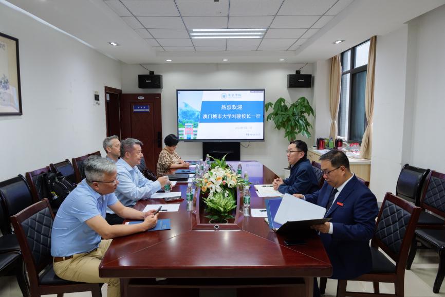 2024年5月11日上午,澳门城市大学校长刘骏一行来访我校。校长董洪川与来宾会见,港澳台办公室、英语学院相关负责人参与会见。