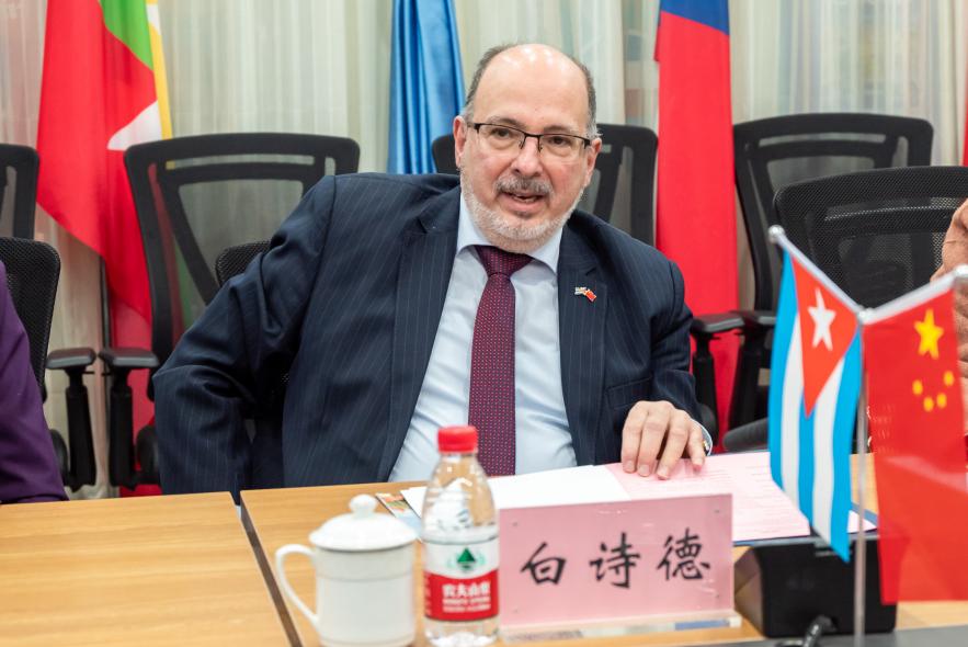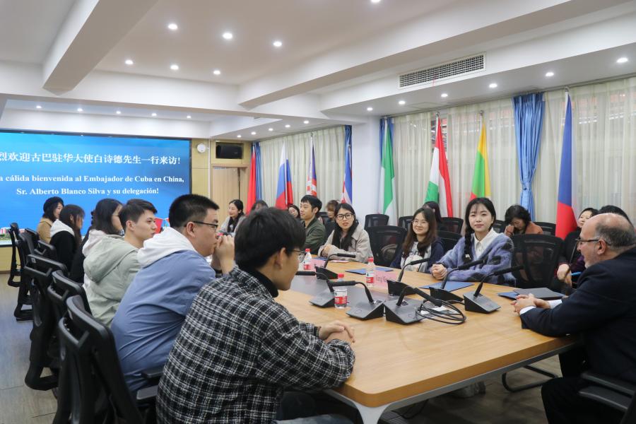 白诗德大使对我校的接待表示感谢。他对中古两国悠久的友好关系进行了回顾,对川外在古巴政府奖学金项目中提供的支持表示感谢,并对我校西班牙语专业建设及人才培养成果给予肯定。他提出,今年是中古教育交流60周年,他愿继续促进川外与古巴高校间的合作,培养更多优秀的西班牙语专业人才,促进中巴两国交往。