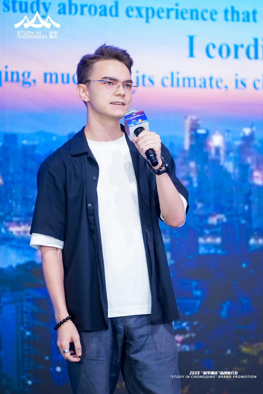 活动现场,俄罗斯籍学生安东作为“留学重庆”宣传大使分享了他的“重庆故事”。从初到重庆时被山城独特的地形与烟火气带来的视觉震撼,到融入本地生活中感悟的市井智慧与求学历程中的成长蜕变,再到通过汉语学习与中国文化产生的精神共鸣,安东用真挚的语言讲述了他与重庆的双向奔赴。他热情邀约全球青年:“来重庆吧,在这里‘渝’见更好的自己!”
