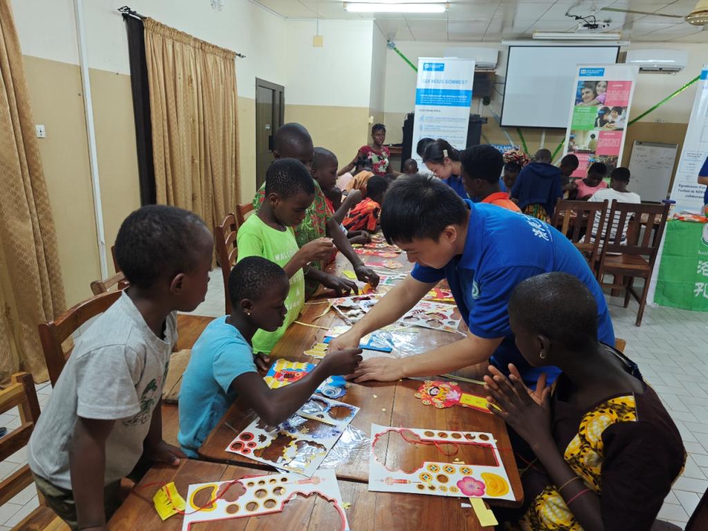 第一个环节是“趣味学汉语”,由孔院老师现场教小朋友们学说简单的汉语。孩子们参与热情高涨,兴趣浓厚,不一会儿功夫就学会了“你好”、“谢谢”、“中国”、“多哥”等汉语词汇。第二个环节是“趣味做手工”。根据儿童善于实践、动手能力强的特点,老师们准备了中华传统手工,有福袋、中国结、元宝、神兽、艺术字等,小朋友们可以根据自己的想法,灵活布局这些中国元素。孩子们积极动手,分工合作,玩儿的不亦乐乎,一幅幅创意十足的作品相继完成,充满童趣。孩子们纷纷拿着自己的作品,热情地跟中国老师拥抱和合影。