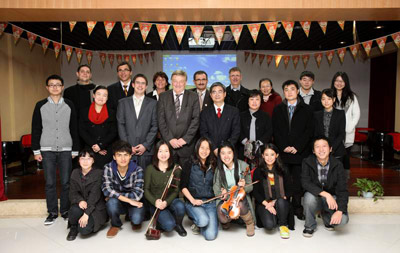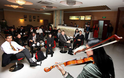 会谈结束后,李克勇校长陪同代表团参观了我校新校区及西区图书馆,并与法语系师生亲切交流。在图书馆咖啡厅,我校师生为代表团表演了丰富的文艺节目。校团委书记丁欢老师即兴学唱法语歌曲《玫瑰人生》,法语系主任尹丽引吭高歌《雁南飞》,把演出气氛推向高潮。