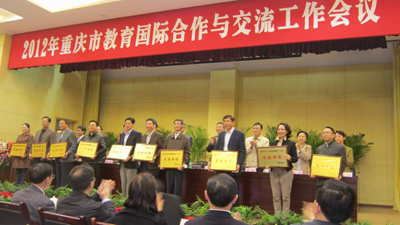 4月12日下午,2012年重庆市教育国际合作与交流工作会在市教委举行,我校荣获“重庆市教育国际合作与交流先进单位”、“重庆市汉语国际推广先进单位”等两项荣誉称号。我校副校长乐勇出席工作会并代表学校领奖。
