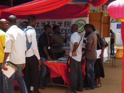 在孔子学院展台上,参观者通过《轻松学汉语》、《汉字入门》、《中国书画家》以及汉语发声挂图等教育资源,现场体验学习汉语与中国文化的乐趣。孔子学院师生在展台前解答了参观者的咨询,向前来参观的师生和社会各界人士介绍了孔子学院办学宗旨、课程设置、开班情况、怎样学习汉语等,许多参观者在展台前学会了“你好!”、“早上好!”“谢谢!”“再见”等简单的问候语,满足的笑容洋溢在他们的脸上。孔子学院学生在本次论坛中还积极参加了校园足球联赛,并在比赛现场表演了师舞。在本次活动中孔子学院与洛美大学师生的交流互动拉近了彼此的距离,孔子学院被越来越多的洛美大学师生生和多哥民众所熟知。