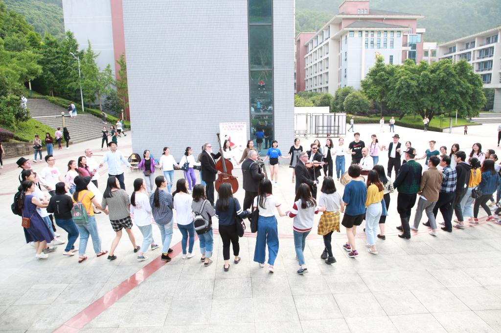会谈后,匈牙利CifraMűhely文化中心表演团的艺术家在我校西区露天圆形剧场为我校师生献上了精彩的匈牙利传统舞蹈表演,和我校师生友好互动,在剧场共舞。来自我校非遗物质基地的丁长福教授和学员们还向匈牙利艺术家们展示了重庆非物质文化遗产金钱板。
