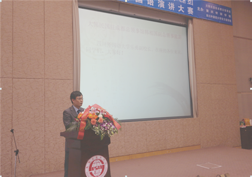 下午2点,由朝鲜语专业同学表演的韩国传统“四物乐”正式拉开演讲比赛帷幕。乐勇副校长及驻成都总领事馆韩相国副总领事分别致辞,预祝比赛圆满成功。