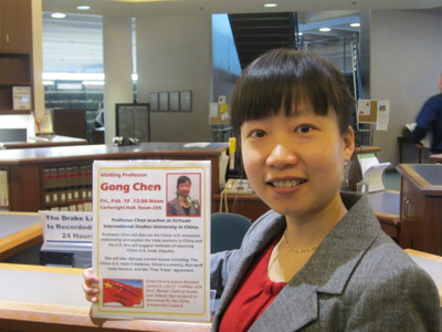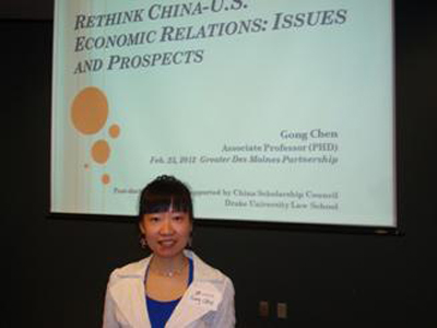 附: 1.德雷克大学为陈功副教授登载的讲座公告及现场照片 http://www.drake.edu/calendar/index.php?year=2012&month=02&day=10&mode=day&category=1 Gong Chen - U.S. and China Trade Issues [Academics] 12:00 PM - 01:00 PM @ Cartwright Hall, Room 205 - Sponsor: Drake Law School Gong Chen is an Associate Professor of Law (Ph.D.) at Sichuan International Studies University, China. She is a post-doctoral research scholar working with Professor Hunter R. Clark at Drake University Law School. Her post-doctoral research program is supported by the Chinese government, China Scholarship Council.