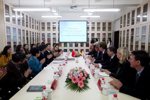 李克勇校长首先对迪克·艾博思市长及其代表团访问我校表示热烈欢迎,并对我校情况做了介绍,指出我校注重发挥语言优势,多层次多方向教学的特点。他指出我校与杜塞尔多夫市有着深厚的渊源,2013年7月,我校与杜塞尔大学签署了深化合作与交流的协议,旨在促进重庆与杜塞尔多夫市在文化教育方面的交流。随后,冯亚琳教授简要介绍了海涅中心情况。海涅中心于十天前在我校揭牌,该中心的历史可以追溯到2006年我校为纪念海涅逝世150周年举行的“海涅周”活动。明年恰逢重庆市与杜塞尔多夫市建立友好城市10周年,海涅中心将筹办“晚年海涅”研讨会,希望能得到德方支持。