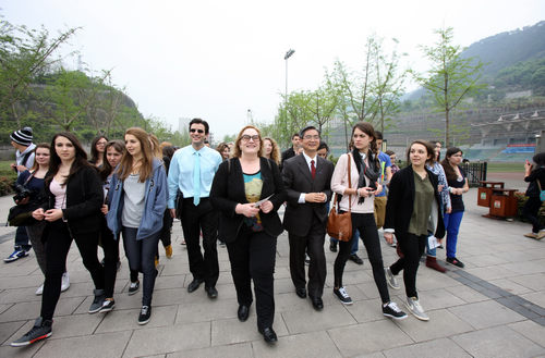 据悉,重庆是皮埃尔保罗时空高级中学师生中国之行的第三站,之前的两个城市分别是北京和天津,但川外是他们参观的第一所中国大学。目前,很多法国中学生对到中国上大学充满兴趣,川外也是他们的选择之一,因此,在图卢兹大学联合体的推荐和安排下,皮埃尔保罗时空高级中学师生来到我校参观访问。代表团的学生大多是第一次到中国,在谈到这次中国之行的时候,同学们表示:“C’est un pays merveilleux! Les gens sont gentils et hospitaliers. ”(这是一个很美好的国家。人们热情好客。)一位胸前挂着单反相机并向往成为一名记者的女生主动询问我校的学制和专业设置,她说她很愿意再来中国或者来中国留学,用自己的镜头记录中国。