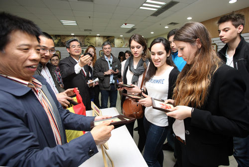 随后,来访客人参观了在西区图书馆四楼美术厅展出的剪纸艺术,并对中国传统剪纸艺术产生浓厚的兴趣。看着栩栩如生的十二生肖图案,有的法国同学请中国学生帮忙推算自己的属相,虽然对中国传统文化不甚了解,但他们对自己有了“属相”这个新“标签”还是喜不自禁。在得知展出的作品都出自川外在校生之手后,法国同学也跃跃欲试。在中国“师傅”的指导下,法国同学开始学习剪纸,一招一式都有模有样。随后,李克勇校长和何天云馆长为来访客人赠送了川外学生手工制作的剪纸作品作为留念。