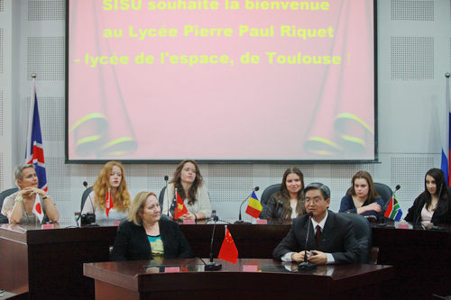 3月27日下午,来自法国图卢兹皮埃尔保罗时空高级中学(Pierre-Paul Riquet)的师生一行30余人到我校参观访问。校长李克勇亲切接见来宾,图书馆馆长何天云、法语国家项目校长助理范大伟、国际合作与交流处、宣传部、国际关系学院、翻译学院等部门工作人员参加接见。来访法国客人先后参观了同声传译实验室、多边国际会议实验室、图书馆、学生剪纸艺术展览厅、歌乐广场和校史馆等。