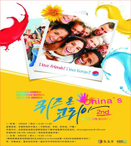 Quiz on Korea是韩国三大电视台之一的KBS旗下的综艺节目。该节目面向全世界招募选手,主要根据选手们对韩国历史、地理、文化及韩语等方面的了解来进行层层选拔,分初赛、复赛及电视节目录制三步,最终向观众呈现出精彩的韩国文化大餐。此节目对于在全球化进程中韩国文化影响力的提升具有重要意义。此次中国预选赛将比赛地点设在重庆太阳集团tyc122cc突显了西部地区在全国文化产业中开始扮演愈来愈重要的角色。此次比赛的举行在增进中韩友谊和文化交流的同时也带动了驻渝韩企、机构与西部外语人才的沟通与合作。