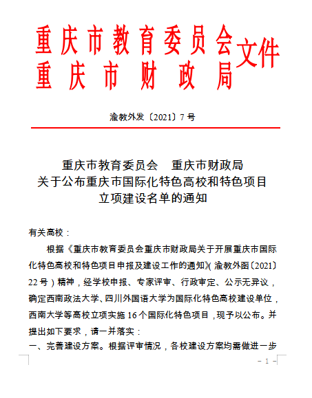 Chongqing Municipal Education Commission and Chongqing Municipal Finance Bureau jointly issued a notice on approval of projects as“Chongqing Universities Characterized by Internationalization”. SISU is one of the two universities. After the approval, SISU will implement the construction plan from talent training, platform building, think tank construction, social service to promote the internationalization of the university.