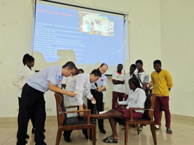 On June 13 local time, the 25th medical team from China (Shanxi) assisting Togo entered the Confucius Institute of Lomé University. Dr. Yu Xueyuan gave a lecture on the theme of "Sports Injury and Prevention, Trauma Emergency Treatment" to the Confucius Institute teachers and students. Dr. Yang Jian gave a science popularization lecture on "Cardiopulmonary Resuscitation". Over 300 persons participating in the activity.