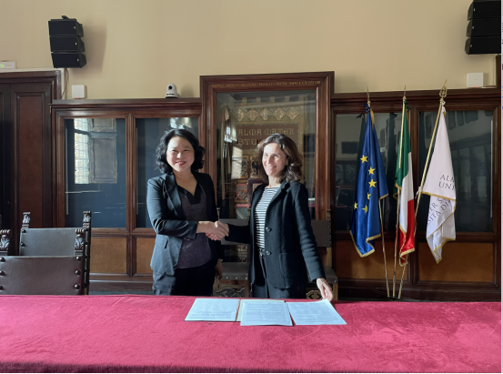 The delegation first visited the University of Bologna, where Vice President Zheng Bailin, on behalf of SISU, renewed the Memorandum of Understanding and the Student Exchange Implementation Agreement with the University of Bologna.