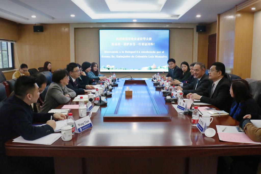 On November 26, the delegation headed by Colombian Ambassador to China visited SISU. After a brief introduction of SISU, president Dong Hongchuan expressed his hope to deepen the exchange and cooperation between the two sides. The Ambassador Luis Diego Monsalve thanked President Dong for his hospitality and hoped that SISU would provide opportunities and scholarships for Colombian youths to study Chinese or other professional fields here.